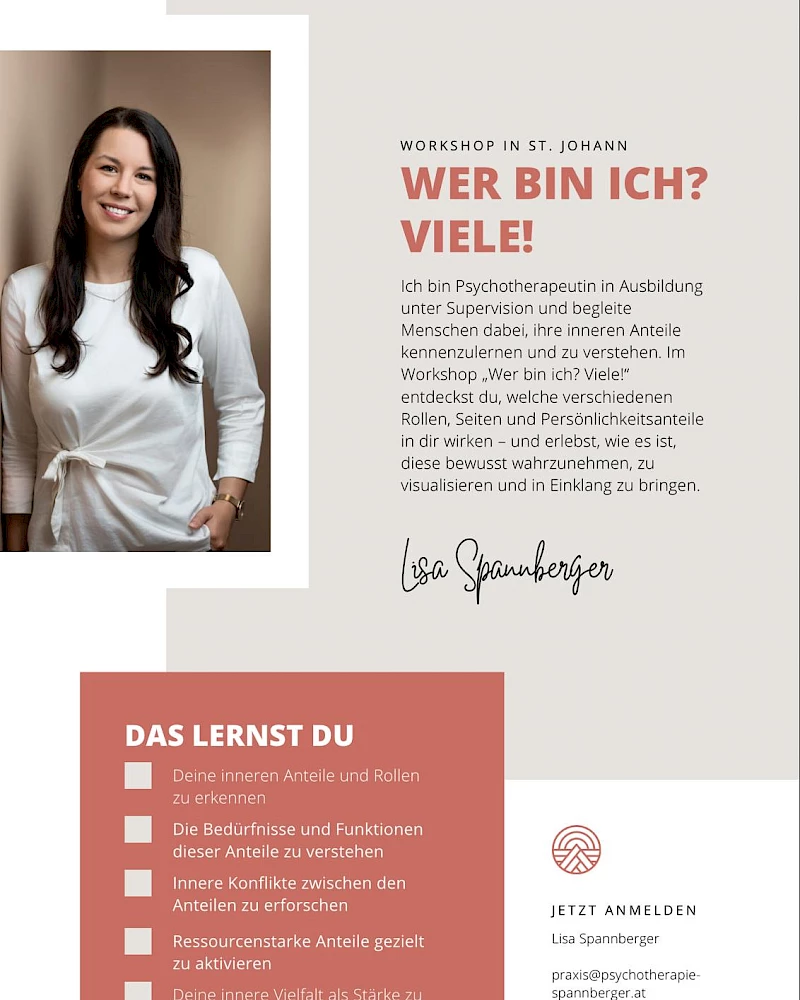 Ich bin Psychotherapeutin in Ausbildung unter Supervision und begleite Menschen dabei, ihre inneren Anteile kennenzulernen und zu verstehen. Im Workshop „Wer bin ich? Viele!“ entdeckst du, welche verschiedenen Rollen, Seiten und Persönlichkeitsanteile in dir wirken - und erlebst, wie es ist, diese bewusst wahrzunehmen, zu visualisieren und in Einklang zu bringen.
