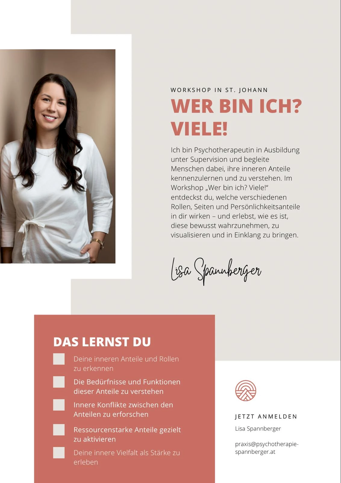 Ich bin Psychotherapeutin in Ausbildung unter Supervision und begleite Menschen dabei, ihre inneren Anteile kennenzulernen und zu verstehen. Im Workshop „Wer bin ich? Viele!“ entdeckst du, welche verschiedenen Rollen, Seiten und Persönlichkeitsanteile in dir wirken - und erlebst, wie es ist, diese bewusst wahrzunehmen, zu visualisieren und in Einklang zu bringen.